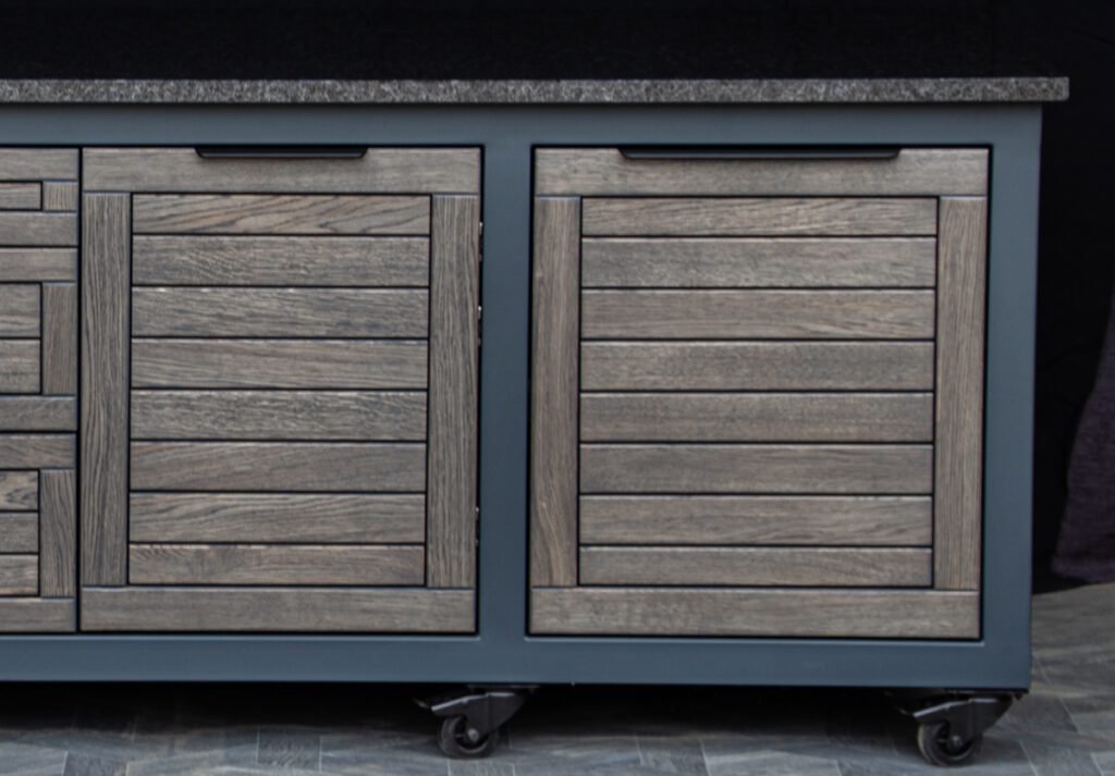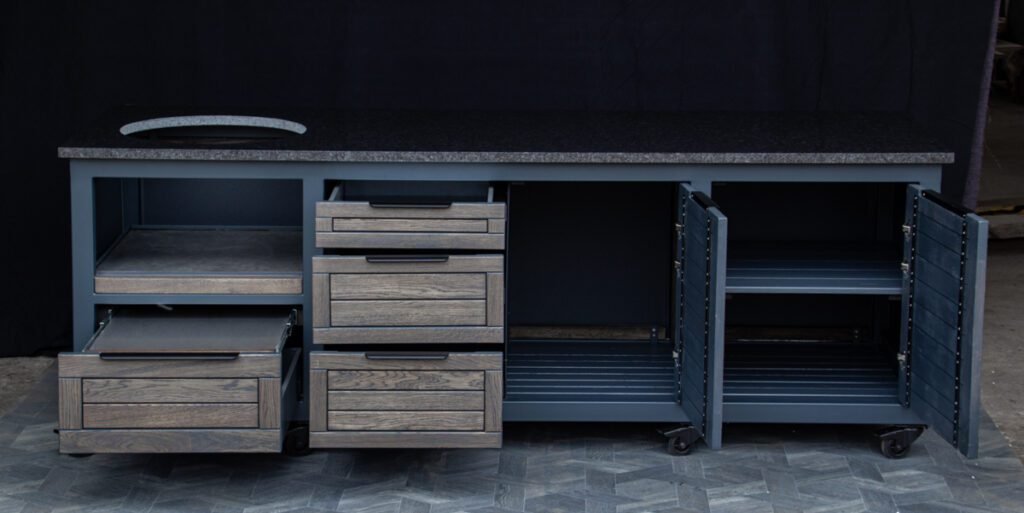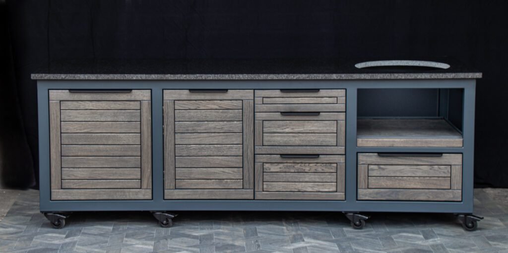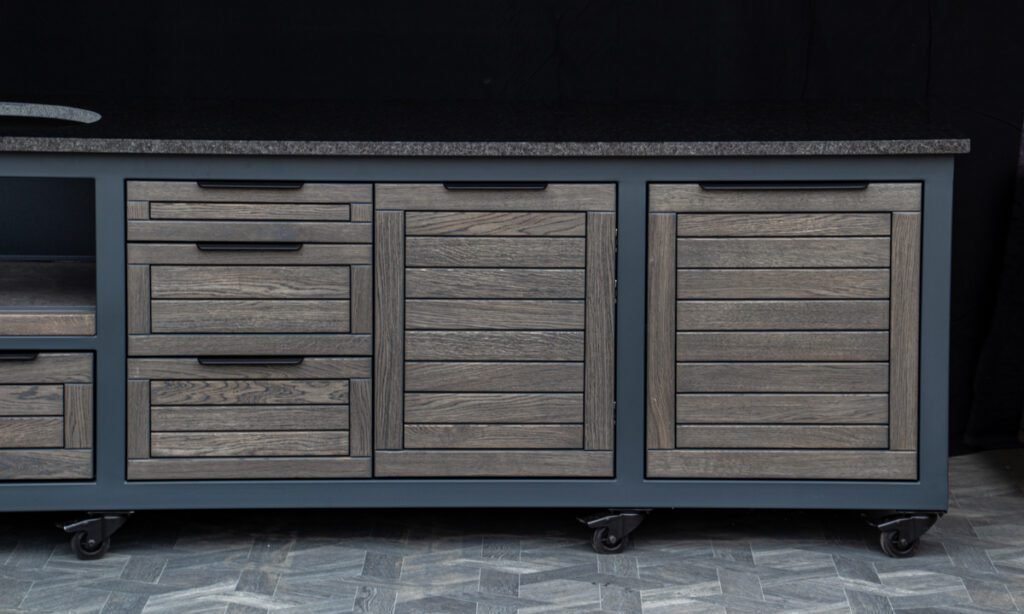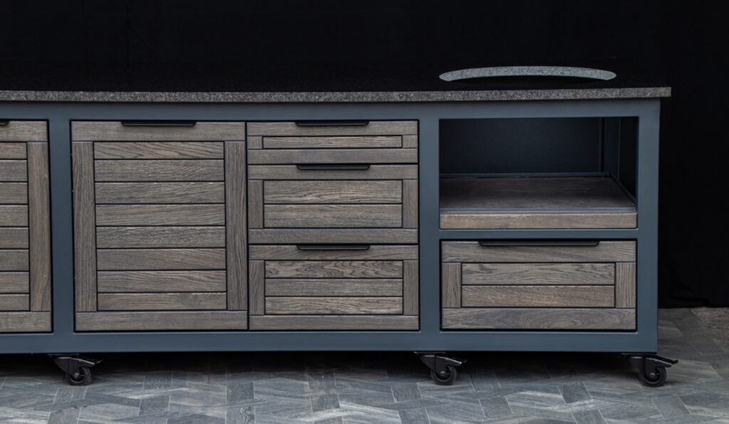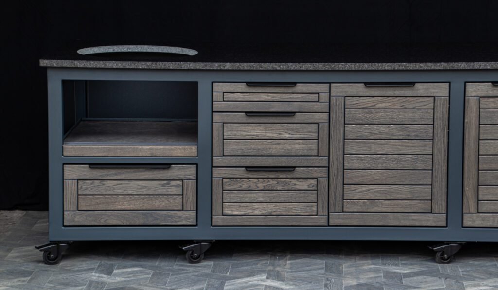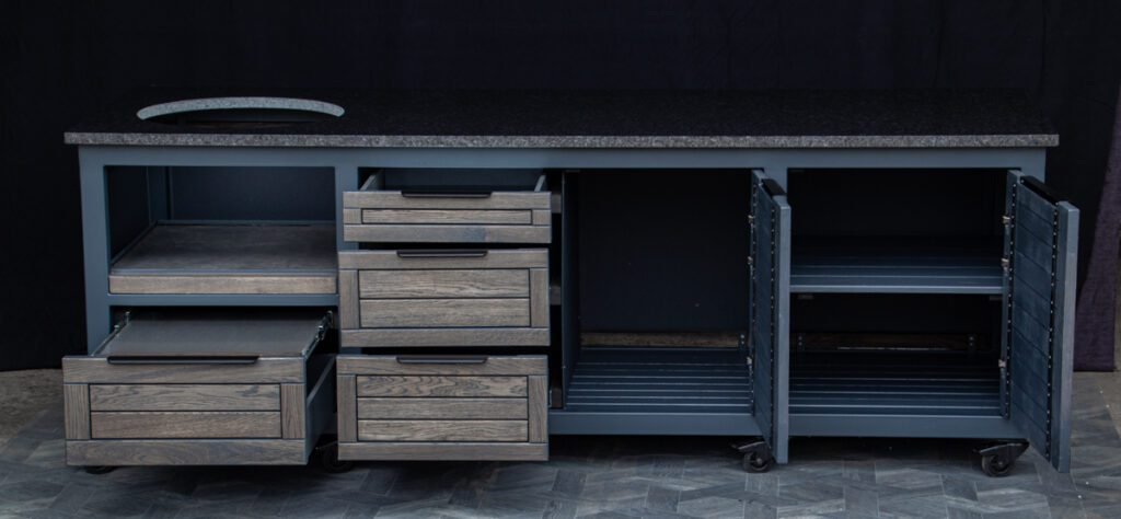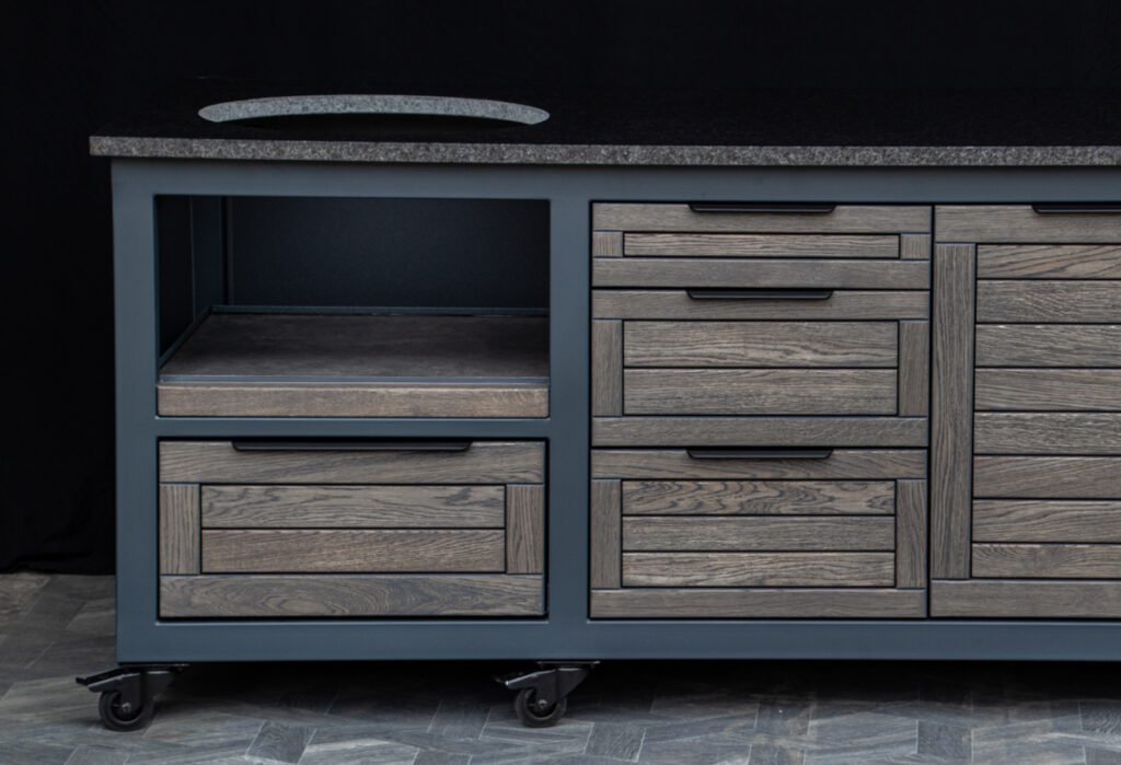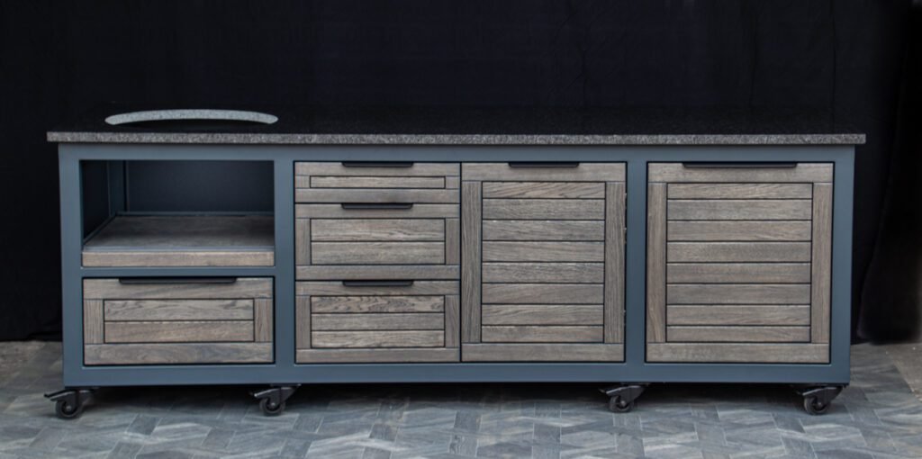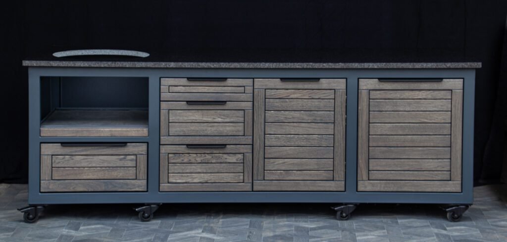 Plieninis karkasas ir natūralaus ąžuolo apdaila. Grill stalas pritaikytas daugeliui BBQ kepsninių –