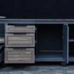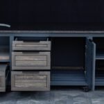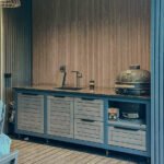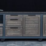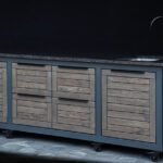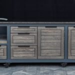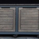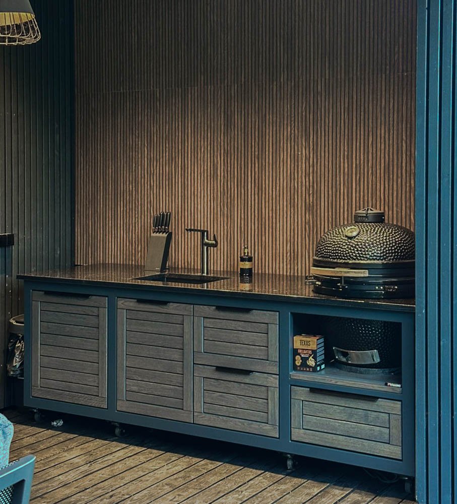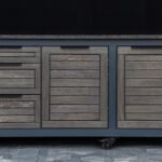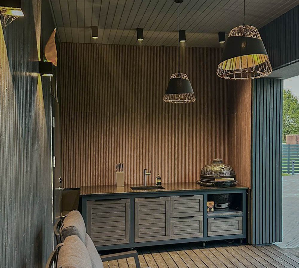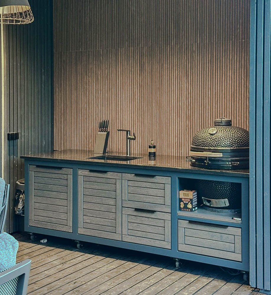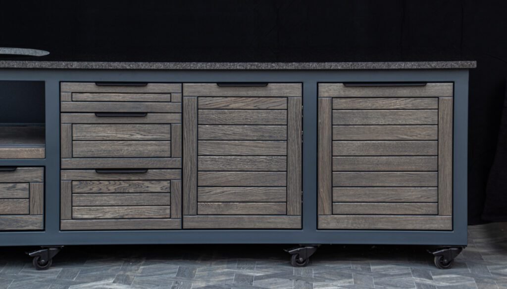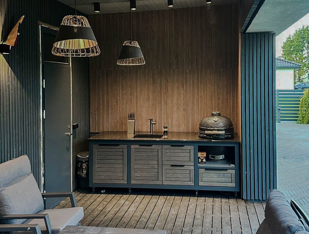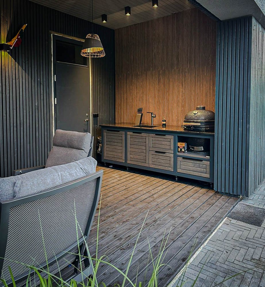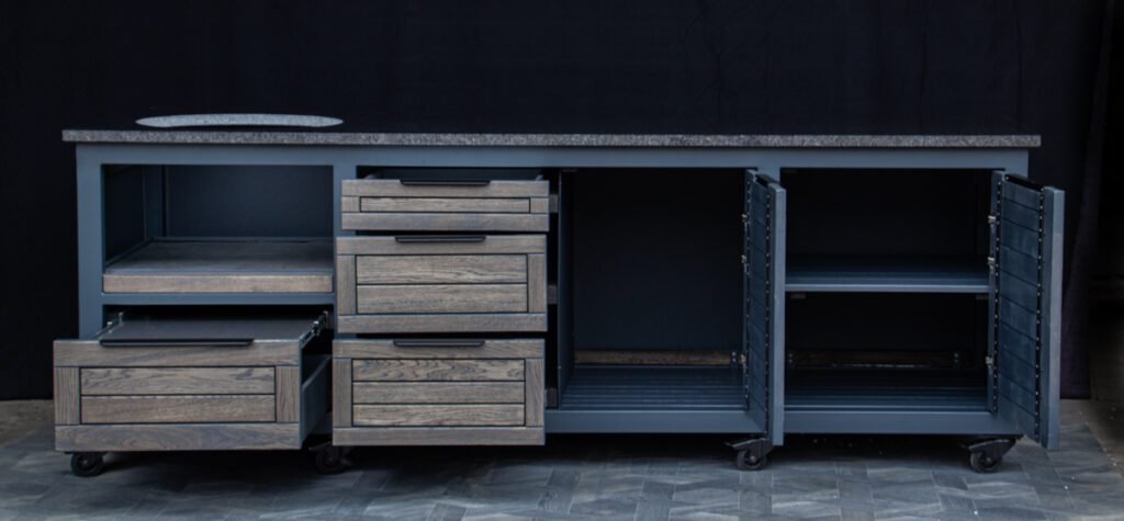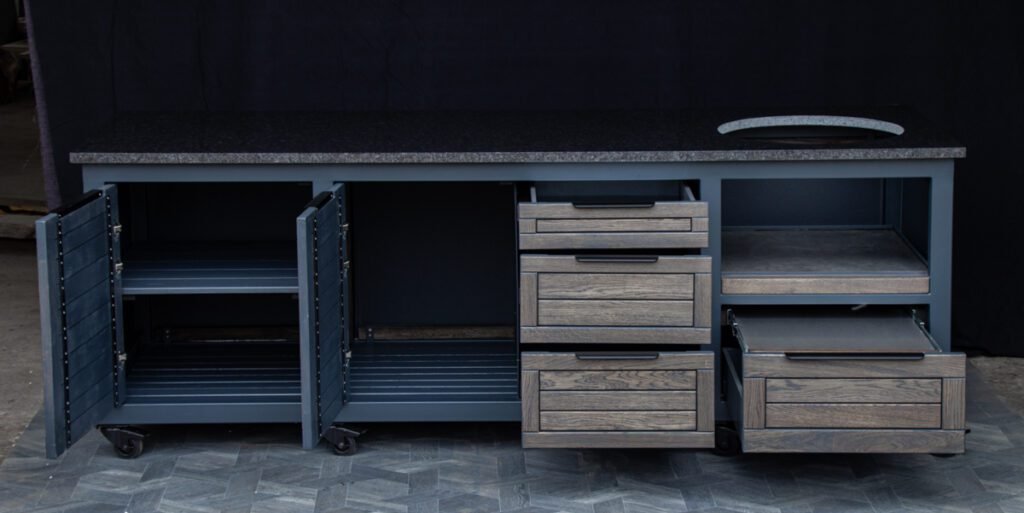 Plieninis karkasas ir natūralaus ąžuolo apdaila. Grill stalas pritaikytas daugeliui BBQ kepsninių –