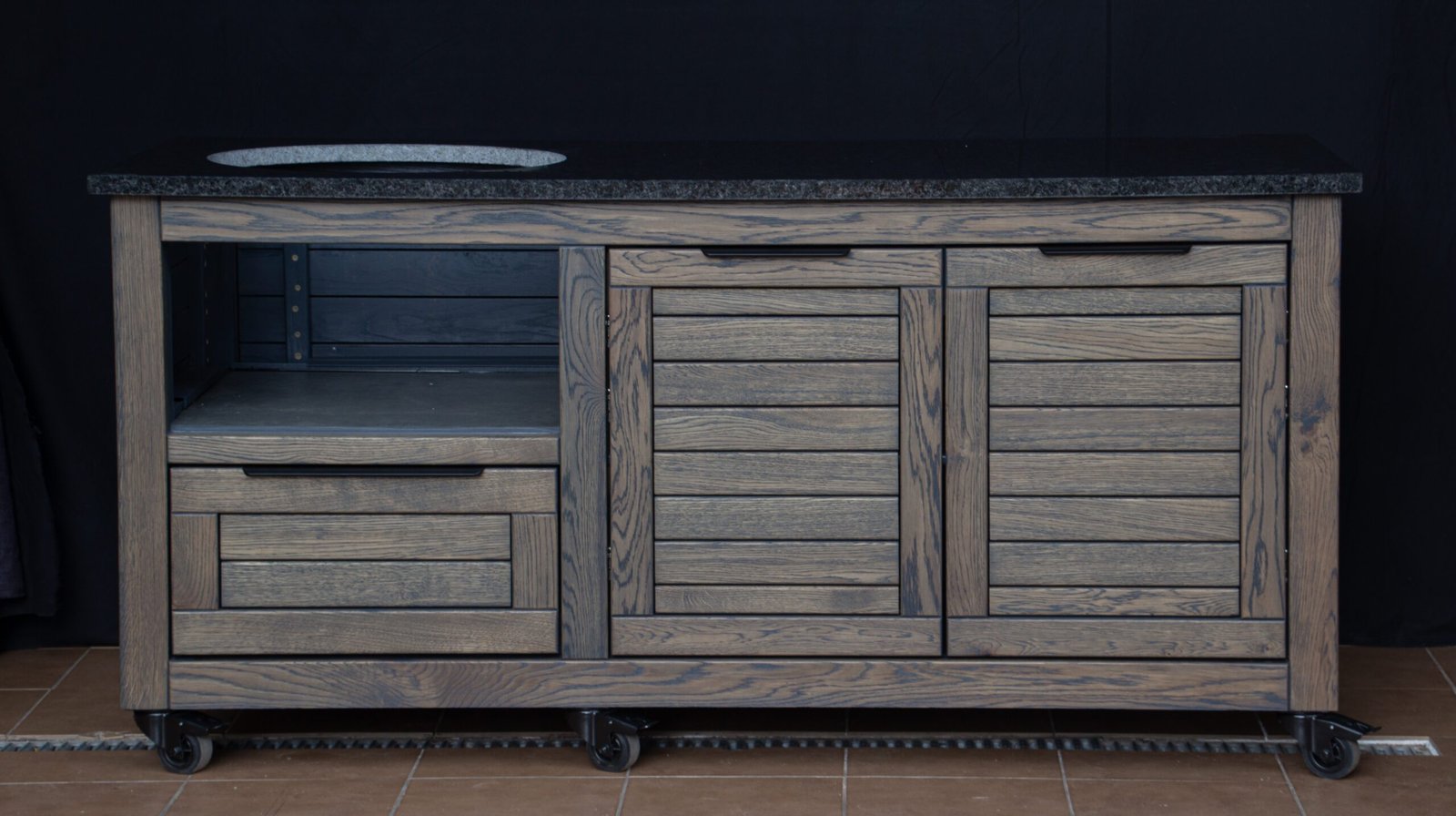 Ąžuolo masyvo, rankų darbo kamado grill stalas pritaikytas daugeliui BBQ kepsninių – Green Egg, Kamado Joe, Kamado BONO, Kamado Club, Kamado Club Pro, Mustang ir kt.