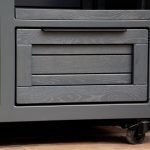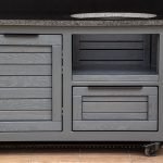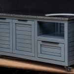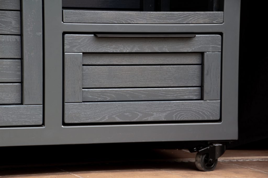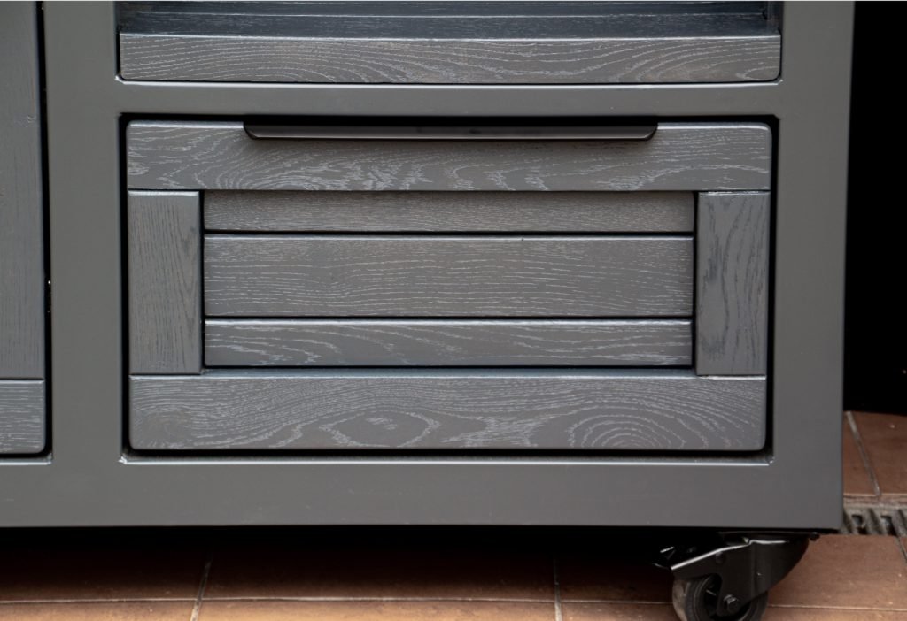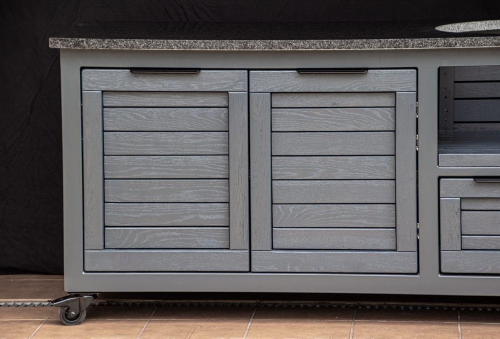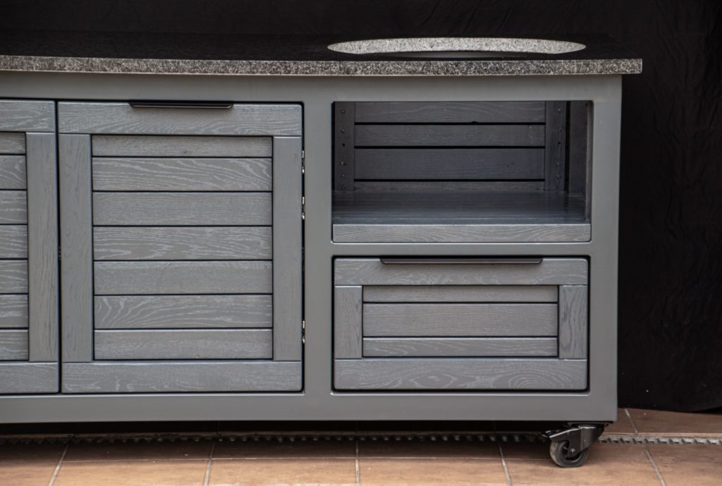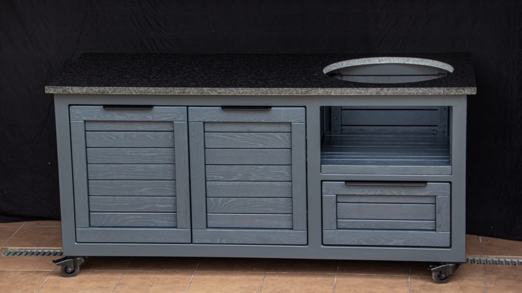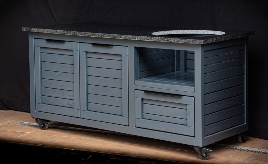 Vientisas metalo rėmas ir natūralaus ąžuolo apdaila. Grill stalas pritaikytas daugeliui BBQ kepsninių –